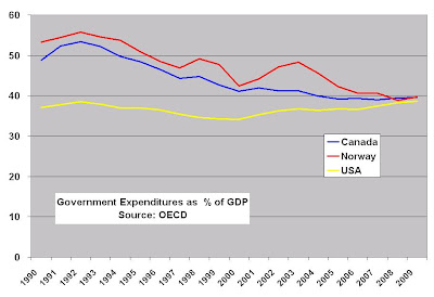 Regardless, I was shocked to find out that pretty much right now, the presumed "capitalist" US and the presumed "socialist" Norway, spend practically the same percentage of GDP on the public sector.
