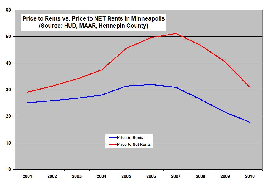 The red line is much more representative of the true over/undervaluation of properties in the MInneapolis area. It takes out the average property taxes one pays (no historical data was at the Minneapolis city's web site so I used my own as a proxy) and then applies the price of the house to NET rents (rental income after property taxes).